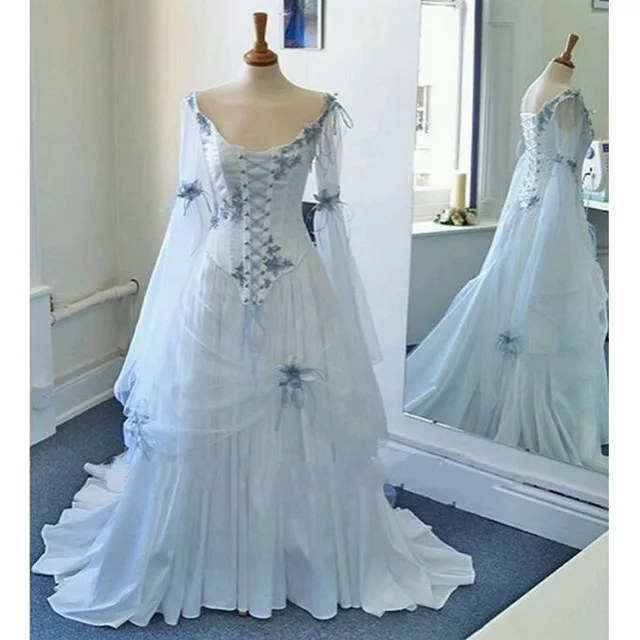 Vintage Keltischen Hochzeit Kleid Weiss Und Hellblau Bunte Mittelalterlichen Brautkleider Scoop Korsett Langen Armeln Appliques Blumen Wedding Dress Wedding Dress Whitebridal Gown Aliexpress
