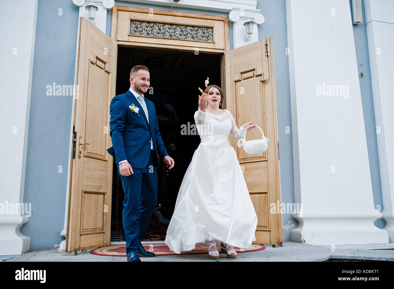 Hochzeit Paar Bonbons Werfen Nach Der Trauung Vor Der Kirche Stockfotografie Alamy