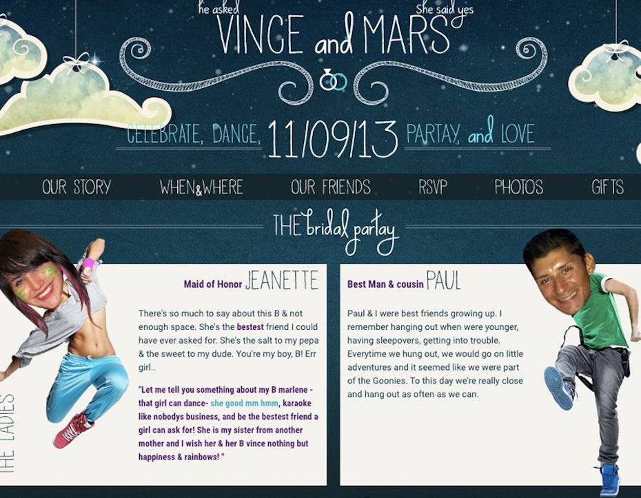 Die Website von Jenny und Grayden ist eines dieser Hochzeitshomepage Beispiele, die die lustige und sorglose Persönlichkeit des Paares vermitteln. Hochzeitshomepage Beispiel Bild 13 Hochzeitshomepage Beispiel Bild 14 Alles auf dieser Hochzeitshomepage passen wir ganz speziell für euch an. Informiert über den Hochzeitstag oder veröffentlicht die Hochzeitsfotos auf eurer eigenen Hochzeitshomepage.